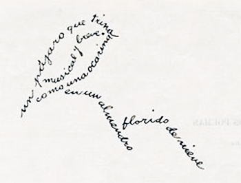 Pero ¿por qué caligramas? Retomando las palabras de mi bienamado Witkiewicz, La poesía que puede formar una representación teatral es un ejemplo de arte mixto que incluso leída, pero ante todo recitada, realiza la Forma Pura, mediante la síntesis de dos elementos diferentes: el sonido y la imagen”[2]. En el caso de los caligramas también estamos frente a un arte mixto que busca ser recitada y nos otorga imágenes, podríamos decir que también representan una Forma Pura del arte al que Witkiewicz hace alusión, sin embargo, la estructura misma del poema, permite obtener una lectura a partir de lo visual (como comunicación no verbal) y a partir de las palabras que se columpian en la imagen, como si fueran un flujo de conciencia que nos permite obtener una representación más completa del símbolo del poema mismo y nos muestra no sólo a través de figuras retóricas, sino a través de una imagen lo que nosotros, como autores, queremos que el lector aprecie.
